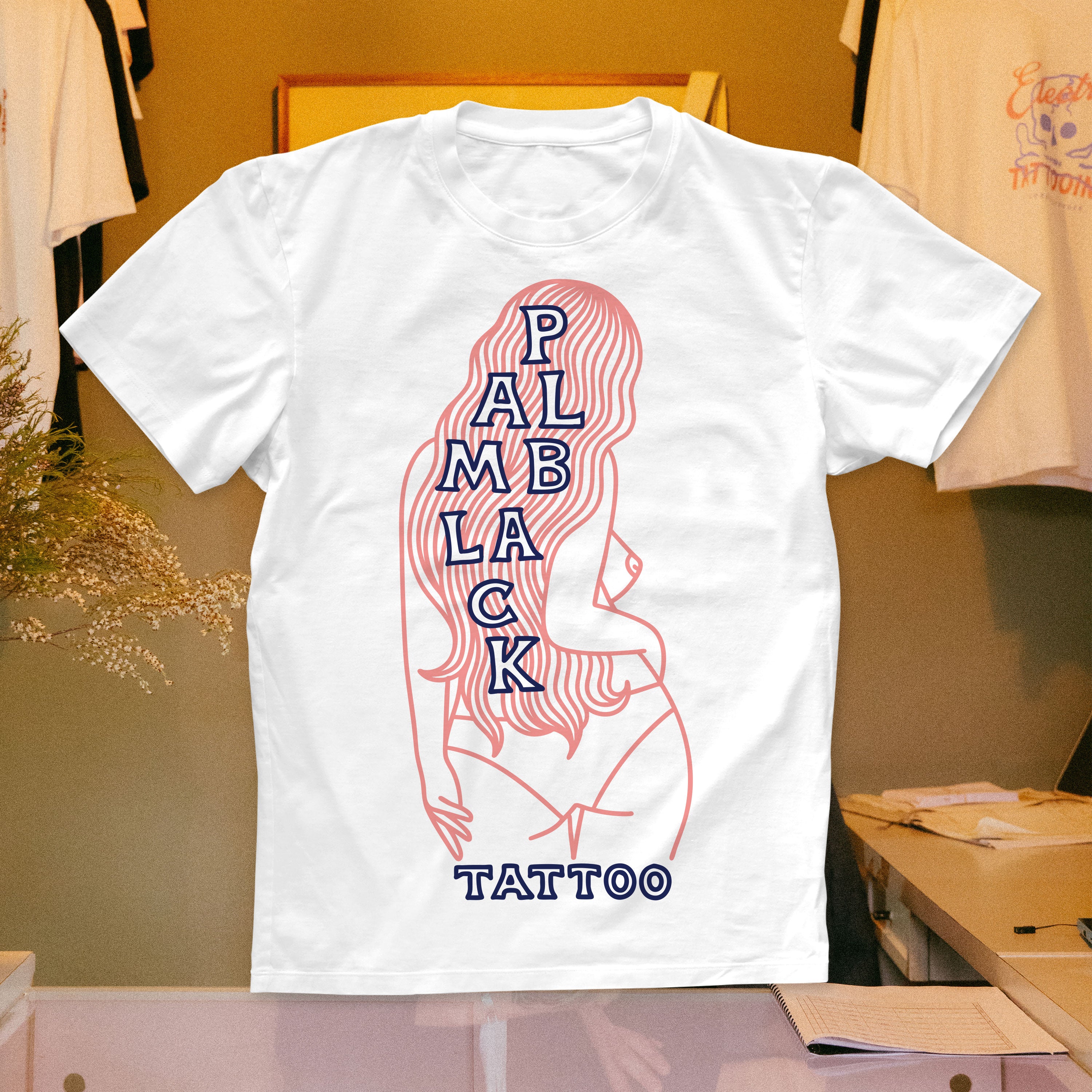 A minimal pin-up graphic on a clean white tee, made to stand out without trying.