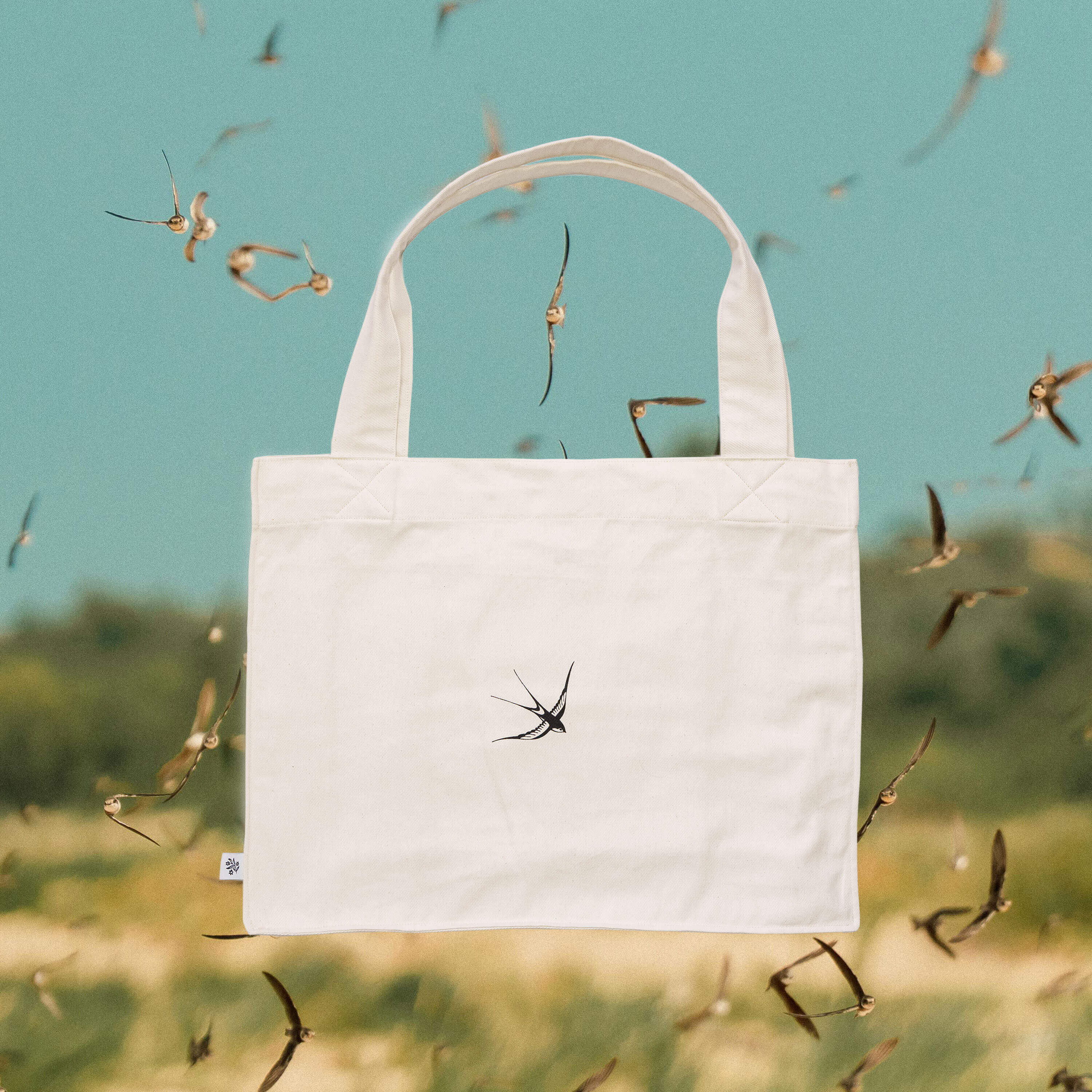 Finished with thick cotton straps for a comfortable carry and an inner pocket with a press stud to keep valuables secure. The front features a subtle swallow print — unmistakably Palm Black.